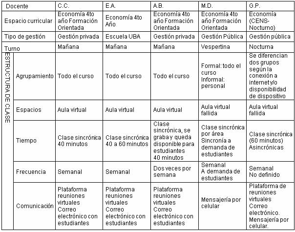 Partiendo del planteo de Basabe y Cols (2010), que sostienen que enseñar es actuar en la urgencia, decidir en la incertidumbre, en escenarios áulicos caracterizados por la inmediatez y multidimensionalidad, es posible pensar que el contexto de la emergencia sanitaria llevó al extremo estas condiciones. Así, las configuraciones de las estructuras de clases detectadas en los relatos de los y las docentes de Economía en escuelas secundarias de la Ciudad de Buenos Aires reflejan, en primer lugar, un arreglo institucional, es decir, una forma de anticipar, reducir la incertidumbre y recrear los espacios, tiempos, frecuencia y medios de comunicación para la enseñanza y los aprendizajes.