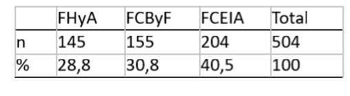 La muestra con la que se trabajó fue por disponibilidad y consta de un total de 504 respuestas válidas de estudiantes de primer año de las tres unidades académicas seleccionadas y, como puede verse en la Tabla 1, consta de 145 respuestas correspondientes a la FHyA (5 % de la población), 155 de la FCByF (19,6 % de la población) y 204 de la FCEIA (27 % de la población).
