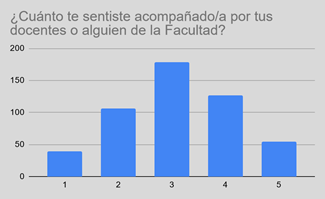 Para ahondar en las percepciones acerca del acompañamiento recibido durante la pandemia, se le solicitó al estudiantado que calificara el modo en que se habían sentido acompañados/as por docentes y miembros de su facultad en una escala de 1 a 5, siendo 1 el extremo más negativo y 5 el más positivo. De los resultados se desprende que, tomando al conjunto del estudiantado de las tres facultades, la mayoría de las respuestas se concentra en un valor de moda igual a 3 (35,3 %, n = 178). Como puede verse en el Gráfico 1, existe una menor proporción de respuestas negativas (1-2) (7,7 %, n = 39, y 21 %, n = 106, respectivamente) en relación con las respuestas positivas (4-5) (25,1 %, n = 127, y 10,7 %, n = 54, respectivamente).