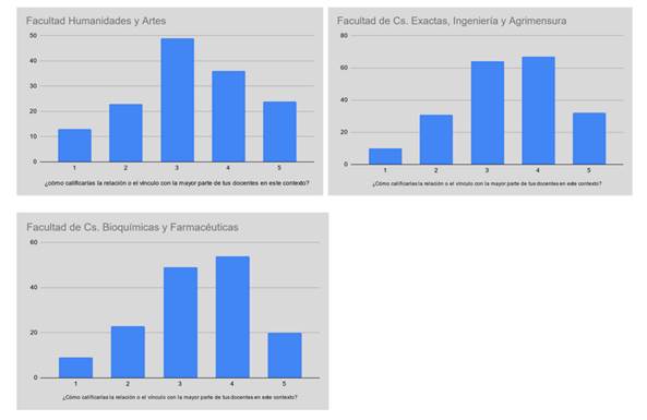 De estos resultados, se desprende que la mayoría del estudiantado del primer año de las facultades en estudio valoró positivamente el vínculo establecido con sus docentes durante el contexto de virtualización forzosa. Asimismo, se observa que, en FCEIA y FCByF, hay una mayor proporción de estudiantes que la valoran muy positiva, respecto de FHyA.