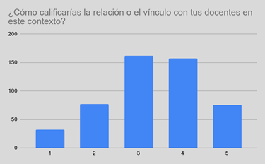Por otro lado, en relación con las percepciones acerca del vínculo con sus docentes, se le solicitó al estudiantado que calificara esa relación con ítems escalares, siendo, al igual que en la respuesta anterior, 1 el extremo más negativo y 5 el más positivo. Del análisis de las respuestas, se halla una tendencia similar al obtenido en cuanto a las valoraciones acerca del acompañamiento.