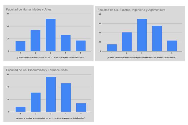 Sin embargo, hallamos que la FHyA concentra los valores más altos en cuanto a las valoraciones negativas (1-2) (11 %, n = 16, y 23,4 %, n = 34, respectivamente) y que la FCEIA evidencia los valores más altos en relación con las respuestas positivas (4-5) (26,9 %, n = 55, y 11,2 %, n = 23, respectivamente). Finalmente, la FCByF posee el valor más alto respecto de la respuesta 3 (36,1 %, n = 56). A partir de los resultados analizados, podemos afirmar que, mayoritariamente, el estudiantado de primer año de las facultades bajo estudio se sintió acompañado/a durante el proceso de virtualización forzosa, si bien se observa una mayor concentración de respuestas negativas (1-2) en la FHyA.