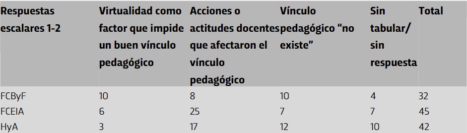 En FCEIA, la mayoría del estudiantado (61 %, n = 25) que calificó el vínculo pedagógico como “malo” o “muy malo” destaca acciones o actitudes docentes que afectaron el vínculo pedagógico. Entre estas, las más frecuentes fueron alusiones a problemas de horarios (se redujeron o no se respetaron), falta de respuestas a consultas realizadas por las plataformas y ausencia de clases sincrónicas.