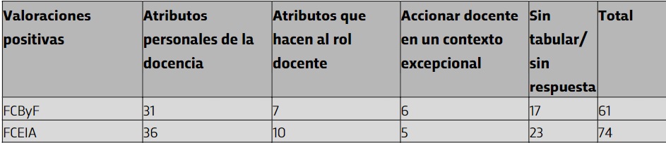 Por otro lado, para ahondar en las valoraciones del estudiantado que calificó a la relación positivamente, profundizamos en las respuestas que concitaron valores más altos por facultades. En tal sentido, analizamos las respuestas 4 en FCEIA y en la FCByF y la respuesta 3 en FHyA. En FCEIA y en la FCByF, pudimos identificar “tipos” de respuestas donde se resaltan distintos elementos del vínculo docente: atributos personales de la docencia, atributos que hacen al rol docente y el accionar docente en un contexto excepcional.