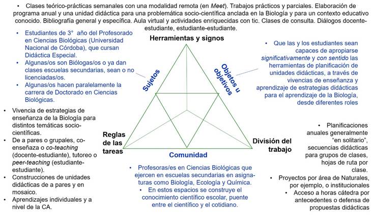 · Contexto: en función del modelo de actividad humana de Engeström (2001), proponemos, en la Figura 1, la representación de los componentes e interacciones centrales de las actividades de planificación, puesta en marcha y evaluación que lleva a cabo el profesorado y quienes cursan la asignatura Didáctica Especial del profesorado en Ciencias Biológicas de la Universidad Nacional de Córdoba (carga horaria de 60 horas durante el segundo semestre). Las reglas de las tareas pueden configurar aquí estrategias de enseñanza que sean medios antagonistas, que se diseñen y desarrollen en grupos en función de las experiencias previas e intereses del estudiantado, ya sea con la o el profesor (co-enseñanza) o entre pares compañeras y compañeros (enseñanza recíproca). En este marco, dos clases fueron abordadas con una modalidad de co-enseñanza (docente titular/investigador y estudiantes de la asignatura en el rol de co-docentes [Eick et al., 2003]), mientras que la reflexión sobre la práctica estuvo orientada, principalmente, por el docente/investigador. De aquí en adelante, denominaremos “co-enseñante(s)” a quienes participaron de esta práctica en el rol docente y como par(es) del profesor titular para dos contenidos de la unidad del programa de la asignatura (estrategias de enseñanza de las ciencias). Entendemos a las estrategias de enseñanza como la creación de escenarios para la construcción significativa y con sentido de conocimientos (en este caso, didácticos) a través del involucramiento genuino de las y los participantes en actividades auténticas relacionadas con las prácticas científicas de referencia (Osborne, 2014). Las estrategias implementadas en las SEA fueron: (a) la Indagación Dialógica Problematizadora (IDP [De Longhi et al., 2014]) y (b) el ciclo de indagación aplicado a la enseñanza de la ecología en el patio escolar (Ecología en el Patio de Escuela, EEPE [Arango et al., 2009]). Las clases llevadas a cabo con las estrategias a y b fueron realizadas en 2020 (en el contexto de pandemia de COVID-19), con una modalidad virtual sincrónica (a través de Google Meet) y tuvieron una duración de cuatro horas cada una.