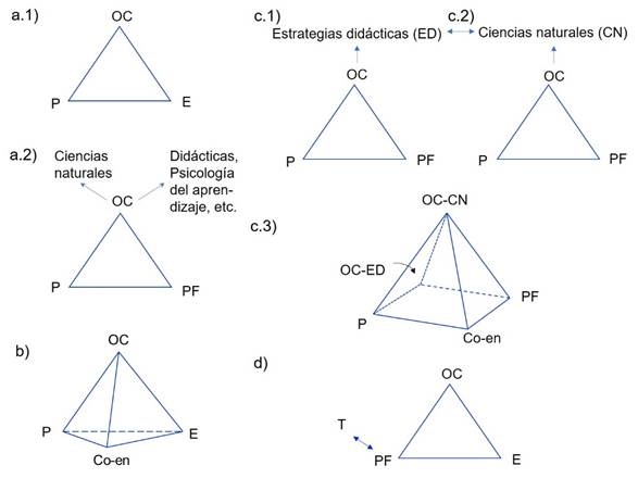 Nota. a-d: ver descripción en el texto principal. P: profesora o profesor. OC: objeto de conocimiento. E: estudiantes. PF: profesoras y profesores en formación. Co-en: co-enseñante(s). T: tutora o tutor.
