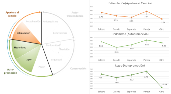 Las tres categorías marcan sus medias más altas para los participantes que viven en pareja; sin embargo, para las categorías Logro y Hedonismo (pertenecientes a la dimensión Autopromoción), las medias más bajas puntúan para los participantes casados, mientras que, en la categoría Estimulación, las medias más bajas corresponden a quienes están separados. Es importante destacar que la mayoría de los participantes que conviven en pareja están en el rango de edad de 24 a 27 años (35,8 %), seguidos por los de 28 a 37 años (30,2 %). Desestimamos la categoría Otros por su escasa representatividad (solo seis casos).