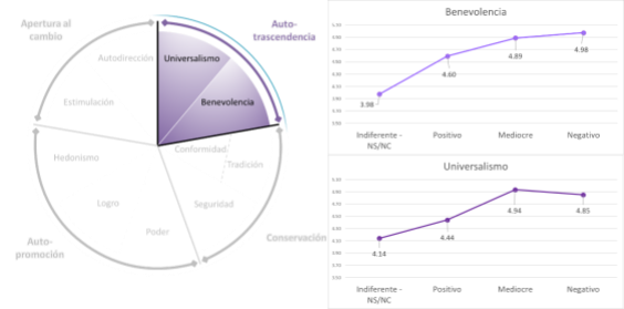 Las categorías que presentan resultados significativos para este análisis son el Universalismo (F = 7,354; p < 0,000) y Benevolencia (F = 6,509; p < 0,000); ambas constituyen la dimensión Autotrascendencia (cf. Figura 5).