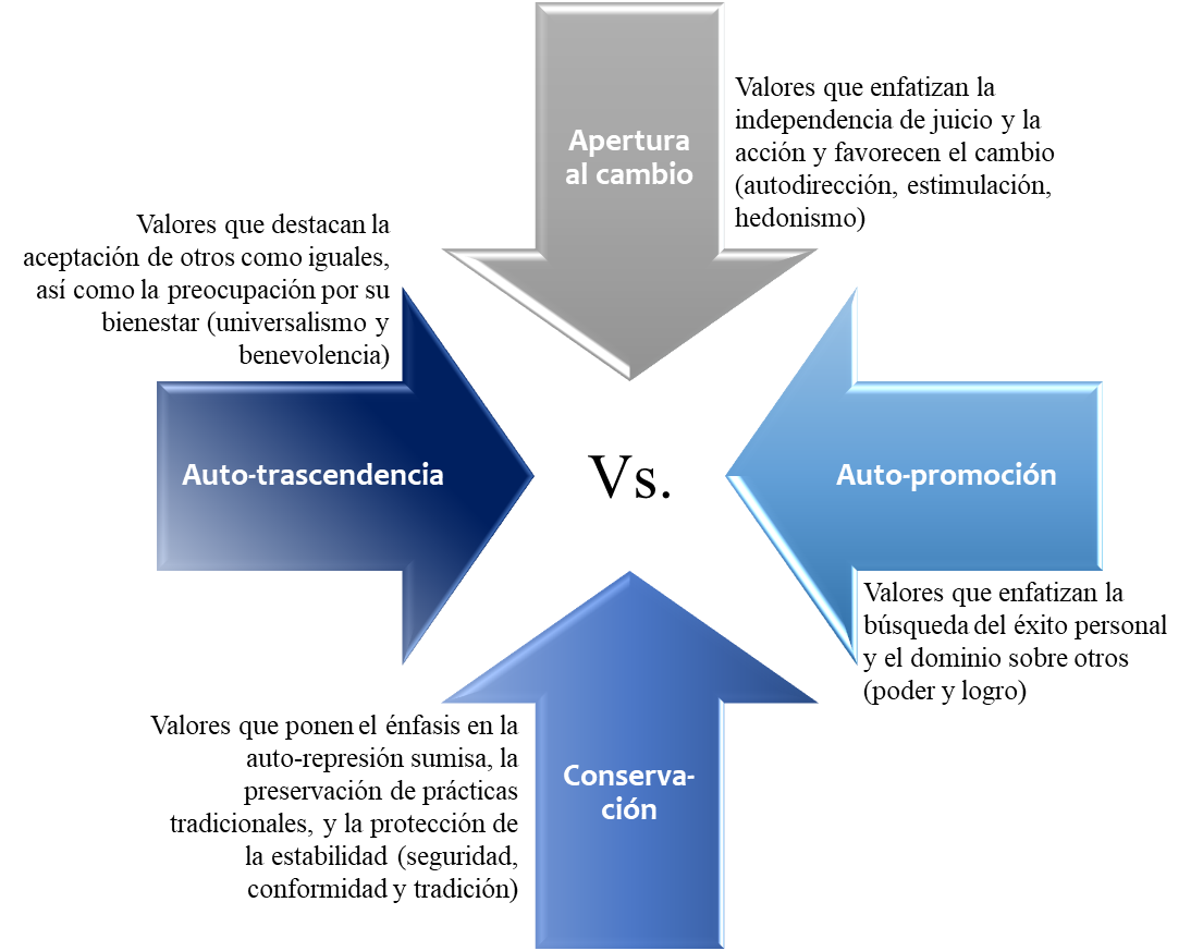 A su vez, este denario de motivaciones está organizado en dos dimensiones bipolares dentro de su propio modelo axiológico. Por una parte, se agrupan los valores que se enfocan en las necesidades colectivas, las cuales conforman una dimensión titulada “Autotrascendencia”, enfrentada a la dimensión denominada con el nombre “Autopromoción”, que se caracteriza por reunir aquellos valores que ponen por encima a las necesidades individuales (cf. Figura 1: Binomio A). Por la otra parte, los valores relacionados con la idea de seguridad se encuentran representados por la dimensión “Conservación”, los que se contraponen con aquellas motivaciones de autonomía individual capitalizadas en la dimensión denominada “Apertura al cambio” (cf. Figura 1: Binomio B).