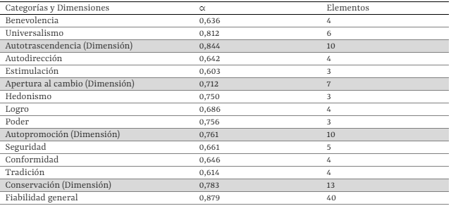 Se realizó un análisis factorial confirmatorio que presentó una óptima consistencia interna (KMO = ,830; prueba de esfericidad: χ² Bartlett = 5239,850; p = ,000). El análisis de fiabilidad del instrumento (PVQ-40) se realizó utilizando el índice Alpha de Cronbach para cada uno de los diez valores que aborda; a su vez, se analizaron las cuatro dimensiones bipolares que se conforman mediante la combinación de dichas categorías (cf. Tabla 1).