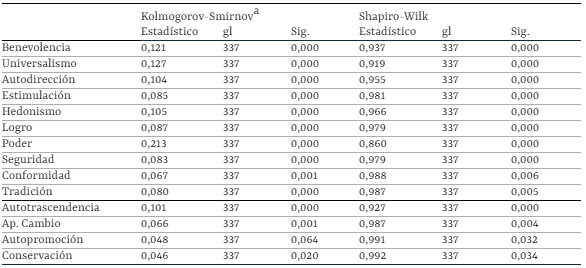 Fuente: Elaboración propia. Análisis efectuado con SPSS®.Las pruebas de Kolmogorov-Smirnov y Shapiro-Wilk sirven para examinar la distribución de los datos y la homocedasticidad de las variables. Para el caso del PVQ-40, en sus factores y dimensiones, muestra una distribución normal (p < = 0.05); lo que implica la exigencia de pruebas paramétricas en el análisis de asociación y correlación de variables.