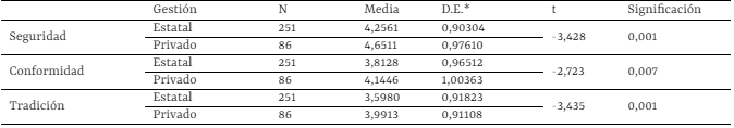 Fuente: Elaboración propia. Análisis efectuado con SPSS®.Los valores resultantes del análisis estadístico “t de Student” expresan que existe una diferencia significativa entre los tipos de gestión institucional (estatal y privado), obteniendo los institutos privados un mayor puntaje en las medias en las tres categorías: Seguridad (t = -3,428; p < 0,05), Conformidad (t = -2,725; p < 0,05) y Tradición (t = -3,435; p < 0,05) (cf. Tabla 4).