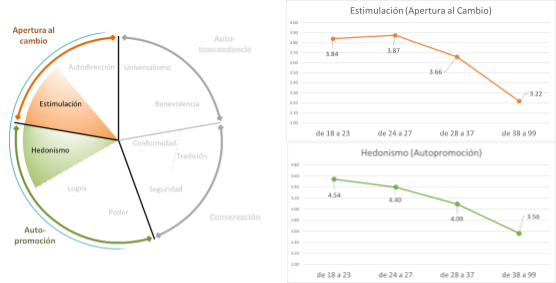 Es relevante observar que, tanto Estimulación como Hedonismo, presentan valores elevados para los rangos de edades inferiores. A su vez, con el incremento de la edad, ambas categorías tienden a disminuir. Estas dos motivaciones están relacionadas directamente con necesidades orgánicas y básicas, las cuales son más comunes en jóvenes que en adultos.