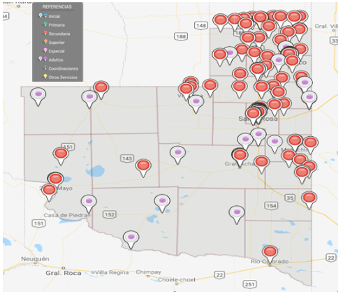 La Ley de Educación provincial N° 2511/09 —en consonancia con los principios de la LEN— regula la educación secundaria obligatoria, siendo el Estado su garante. No obstante, la desigual distribución de recursos y oportunidades educativas entre zonas rurales y urbanas configuran, en la provincia de La Pampa, un escenario en el que aún existen localidades y parajes rurales donde la educación primaria de jóvenes y adultos/as constituye una deuda pendiente. Según un informe del Ministerio de la Producción de La Pampa (2014), las 79 localidades que integran la provincia pueden distribuirse en dos grandes sistemas según su grado de urbanidad: uno Integrado y uno No Integrado, delimitados por una línea diagonal que atraviesa la provincia del noreste hacia el sureste. El Sistema Urbano Integrado contiene casi el 92 % de la población de la provincia, se concentra en la zona noreste y está fuertemente interconectado y estructurado desde lo territorial; en detrimento del Sistema Urbano No Integrado, en el que predominan las localidades pequeñas y parajes rurales, distribuidos en el suroeste de la provincia, débilmente interconectados y con carencias infraestructurales.