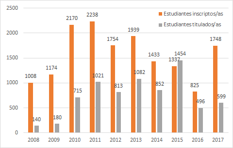 Como puede observarse, si bien el número de titulada/os desciende drásticamente en los años 2016 y 2017, la matriculación de jóvenes y adultos/as al Plan se sostiene e incluso crece en estos mismos períodos, hecho que, consideramos, da cuenta de la persistencia de la demanda de la política por parte de jóvenes y adultos/as para culminar sus estudios secundarios.