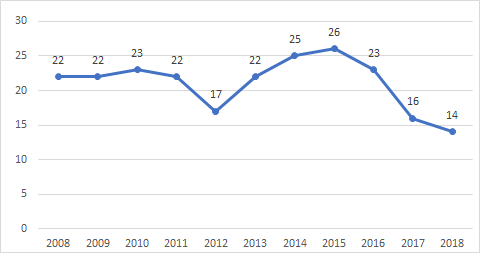 En cuanto al Plan FinEs, el número de estudiantes titulados/as en la provincia posibilita advertir cierto “éxito” de la política en su primera etapa (2008-2012) y los dos primeros años del inicio del segundo período de su concreción con la creación de hasta 26 sedes, número que comienza a descender en el segundo período (2012-2018), a partir del año 2016, hasta dar por cerrado formalmente el Plan en la provincia a mediados de 2018. Los siguientes gráficos detallan el número de jóvenes y adultas/os inscriptas/os en contraste con las/os egresadas/os en cada año del período 2008-2017[vii] (Gráfico 1), y la variación respecto al número de sedes creadas en el período 2008-2018 en La Pampa (Gráfico 2):