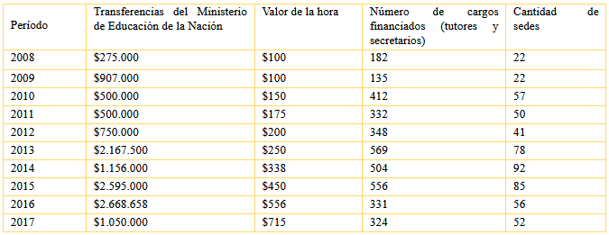 Este tipo de distribución de los fondos no es privativa de La Pampa, sino que ocurre en otras jurisdicciones del país, como Santa Fe, San Juan y Tucumán. Como sostiene en su análisis Viego (2015), el Consejo Federal de Educación dispuso, en 2008, la transferencia de 38,9 millones de pesos (94 % de los fondos presupuestados) a las provincias para la concreción del Plan FinEs, destinando el 6 % restante a la elaboración de materiales para los/as estudiantes y la capacitación de equipos técnicos provinciales. De ese 94 % —advierte Viego—, es llamativa la baja retribución y las precarias condiciones de contratación de quienes se desempeñarían como docentes tutores/as. Explica que, durante la primera etapa del Plan, los/as docentes tutores/as percibieron $500 por mes o $1000 por materia o espacio curricular, “cifra que representaba 37% de la remuneración de bolsillo de un cargo de profesor de nivel medio en 2008 en la provincia de Buenos Aires” (Viego, 2015, p. 7). Respecto a las condiciones, se trató de montos no remunerativos ni bonificables, no considerados en la suma de fondos previsionales docentes, aunque sí imponible de impuesto a las ganancias.