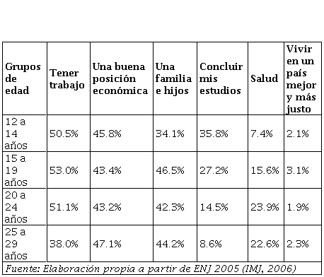 De los datos de la ENJ 2005 (IMJ, 2006), se tomaron las respuestas a tres preguntas que se desglosan así: En tu opinión, qué es preferible: ¿planear la vida o adaptarse a los acontecimientos?; ¿Qué tan de acuerdo o en desacuerdo estás con la siguiente afirmación?: El futuro es tan incierto que es mejor vivir al día: y ¿Cuáles son las tres primeras cosas que en lo personal esperarías en el futuro? La encuesta referida se realizó a nivel nacional y, según su nota metodológica, sus enunciados se construyeron de manera afirmativa para ser respondidos mediante afirmaciones dicotómicas o bien mediante escalas de acuerdos o desacuerdos. Para este trabajo, se utilizan los datos que, en la encuesta, se construyeron en la región centro, que incorporó a los jóvenes que, en 2005, habitaban la Ciudad de México y los Estados del centro de la República Mexicana. La dimensión etaria incluye a jóvenes entre 12 y 29 años (IMJ, 2006).