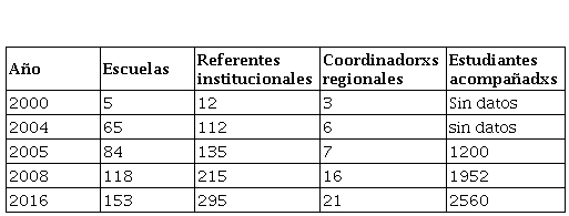 Entre 1999 y 2019, el Programa se fue expandiendo por la Ciudad, generando dispositivos pedagógicos y estrategias de acompañamiento que garantizaron el derecho a la educación. En términos cuantitativos, para el año 2016, acompañó a 2560 estudiantes y 153 escuelas. Además, formaron a 295 referentes institucionales[iii] e incorporaron a 21 coordinadorxs regionales[iv].