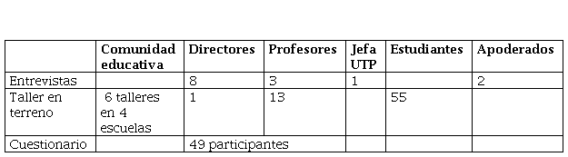Participaron Equipos de gestión, docentes y estudiantes de 8 escuelas rurales de la región de la Araucanía que trabajan con un enfoque curricular orientado a la educación intercultural y que tengan E+. Se empleó una metodología cualitativa complementada con una metodología cuantitativa. La producción de información se realizó a través de dos superficies, 1) taller digital, a través de plataformas electrónicas (4 escuelas); 2) talleres presenciales, mediante visitas a terreno (4 escuelas). Las técnicas cualitativas de producción de información en ambas superficies fueron las entrevistas semiestructuradas, grupos de conversación y talleres con profesores (as) para el levantamiento de propuestas de uso de los recursos. Adicionalmente, en las visitas presenciales se empleó una metodología observacional para cartografiar los espacios educativos, la infraestructura y el equipamiento disponible para el uso de medios audiovisuales/digitales. Al término del proyecto se devolvió a las escuelas participantes los resultados del estudio.