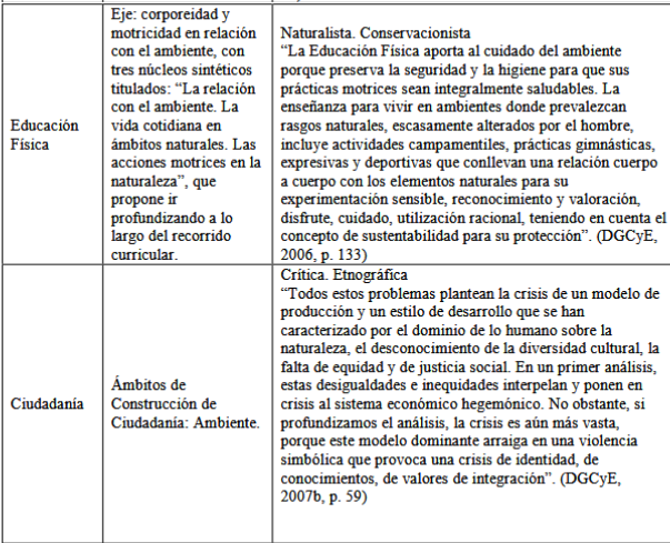 Sintetizamos resultados de nuestro análisis de los diseños curriculares, respecto a la presencia de las diversas corrientes de la EA, en la Tabla 1: