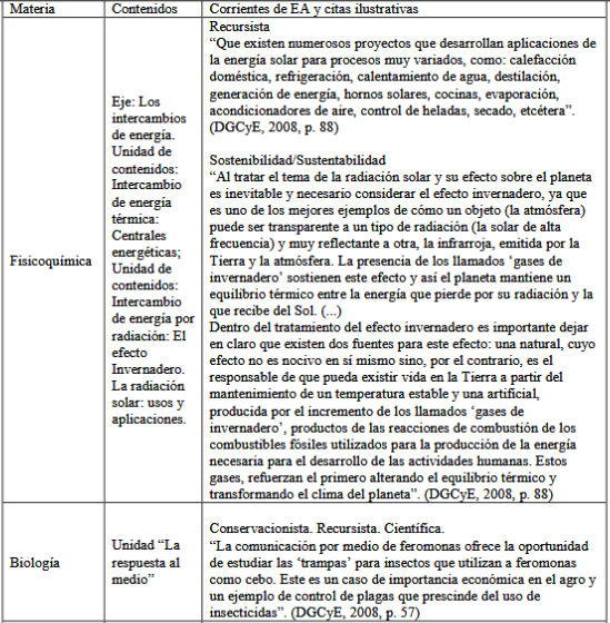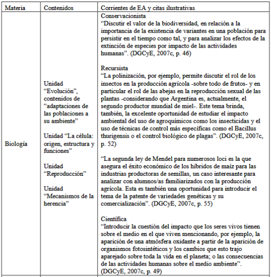 A continuación, en las tablas 2, 3 y 4, se desglosan elementos seleccionados del análisis de las materias de 1º, 2º y 3º año de la ESB, a fin de ilustrar las corrientes de EA identificadas. En la columna de contenidos, explicitamos las unidades o ejes temáticos en los que tales elementos fueron identificados.