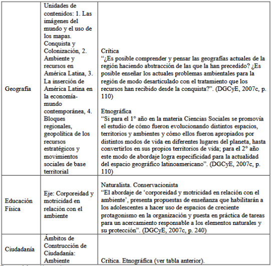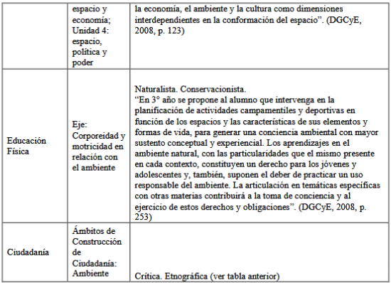 Respecto de Geografía, las perspectivas crítica y etnográfica se manifiestan no sólo en la propuesta de reflexión acerca de las diversas racionalidades posibles “explotacionistas, conservacionistas y sustentables, entre otras, en el manejo de los recursos”, sino, además, en el tratamiento de “problemas ambientales actuales en torno a la explotación forestal, el boom sojero y los recursos minerales. Las diferentes responsabilidades de las empresas, el estado y la ciudadanía en la sustentabilidad ambiental” (DGCyE, 2008, p. 140). Tal intención, si bien no se enuncia en términos de conflictos socioambientales, visibiliza las discusiones en torno a “La progresiva restricción al acceso y progresiva mercantilización/privatización de los bienes comunes o de uso común de la Tierra: la situación en la Argentina” (DGCyE, 2008, p. 148).