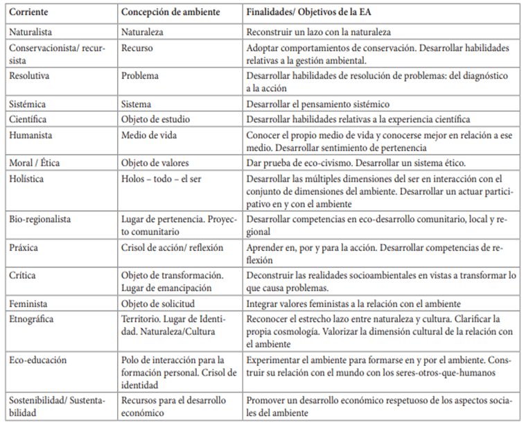 Algunes autores del PAL, al igual que nosotres (Condenanza y Cordero, 2013; Iribarren, 2018), retoman los trabajos de Sauvé (2004, 2010), que definen un conjunto de 15 corrientes en EA, a partir de sus concepciones de ambiente y los objetivos o finalidades que persiguen. En la Figura 1, presentamos un cuadro síntesis de dichas corrientes, cuyas categorías orientaron parte del análisis realizado.