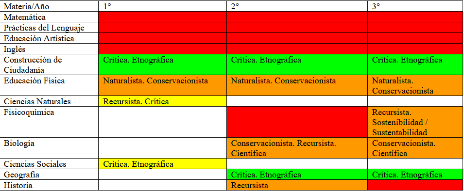 elaboración propiaEl diseño curricular para el 1° año ofrece una formación en Ciencias Sociales, Ciencias Naturales y Construcción de Ciudadanía desde una perspectiva crítica de la EA. Se combina con una perspectiva etnográfica (en el caso de la primera y la última), y con una perspectiva recursista (en Ciencias Naturales). En cambio, en Educación Física, aparecen las perspectivas naturalista y conservacionista.