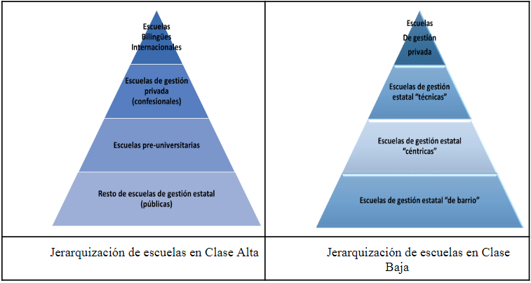 En ambos extremos del campo social, la educación de gestión estatal es estigmatizada, aunque los efectos de dicho proceso difieren. Nos referimos a que, en la clase alta, ese proceso se transforma en un ennoblecimiento de la educación recibida. Por el contrario, la clase baja avizora un futuro más desolador, dando cuenta del enorme esfuerzo que deberán comprometer para ingresar al mundo laboral o los estudios superiores. Bourdieu (1990) lo entiende como la dimensión política de la lucha simbólica por instalar una visión del mundo. Las familias de clase alta ven a las escuelas públicas como un todo homogéneo y, correlativamente, las de clase baja ven a las de gestión privada como otro todo homogéneo: garantía de un ascenso social que, en otra época, prometía la educación pública y al que no pueden alcanzar por el valor de la cuota.