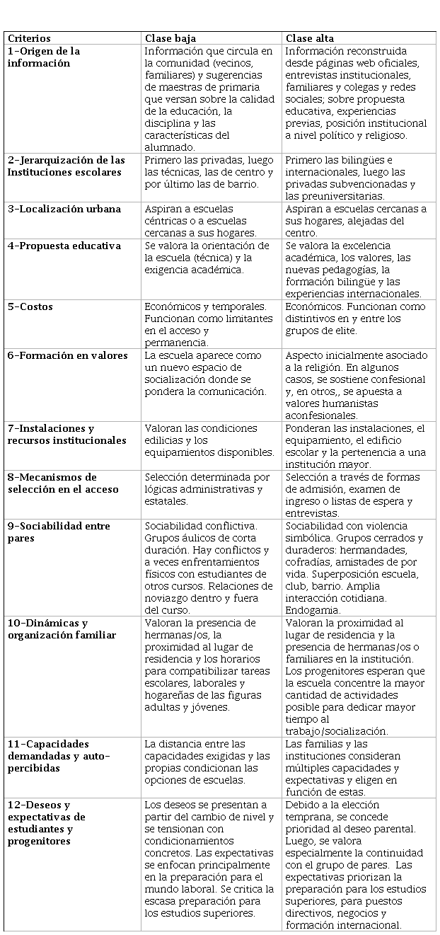 En adelante (Cuadro 1), consideramos un conjunto de criterios que intervienen en la elección escolar en ambos extremos del espacio social y que desarrollamos a continuación.