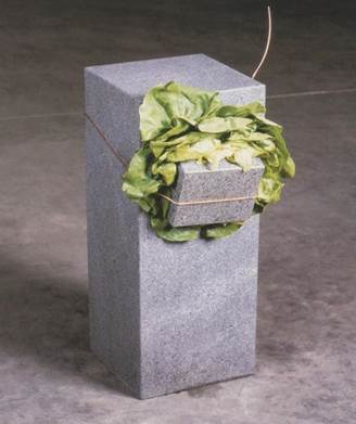 Las piedras de bastantes kilos se aguantan por su propio peso con un hilo a través de un nudo detrás de la piedra mayor, lo que da cuenta de que la gravedad no es magia. El escultor se anima con lo vivo y con lo inerte y de esto da cuenta esta obra de la lechuga en la que un bloque de granito unido por otro bloque pequeño se aguanta en su situación mientras esté viva, mientras tenga agua. En el momento en que la lechuga se seque, la piedra caerá. Quieta, inmóvil, expuesta a los fenómenos atmosféricos, hasta confundirse con ellos: resultado de la territorialización (Coccia, 2017) y la construcción de lazos. Anselmo ilumina la importancia de la lechuga para mantener a la piedra en su sitio, construye realidad, da cuenta de una narrativa anclada en una presentación del mundo a través de lo que es natural. Esas piedras son piedras, pero también color. La lechuga también lo es, y sabor.