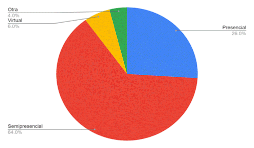 Resumen: El artículo presenta tendencias docentes en materia de preferencias por modalidades de dictado de sus asignaturas (presencial, semipresencial o virtual) tras haber transitado la pandemia por COVID-19, durante la cual fue obligado sostener la enseñanza virtualmente. Se realizó un estudio exploratorio, descriptivo, de diseño no experimental, sustentado en un enfoque mixto, de modo que se trabajó con datos de naturaleza cualitativa y cuantitativa. Participaron 169 docentes de universidades argentinas quienes dieron respuesta a un cuestionario dentro del cual se consulta por la modalidad de preferencia para el dictado de asignaturas, así como por los motivos que justifican dicha elección. Los resultados muestran una mayoritaria elección de la semipresencialidad, entendida por el profesorado como una modalidad que atiende a las necesidades del alumnado, a quienes permite, al combinar presencialidad y virtualidad, acceder a ciertas ventajas sobre las opciones pedagógicas puras y asegurar mayores niveles de inclusión.