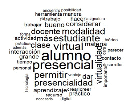 Por su parte, quienes optaron por la modalidad presencial (26%), han mencionado con mayor frecuencia los términos ‘alumnos’, ‘presencial’, ‘virtual’, ‘virtualidad’, ‘presencialidad’, ‘interacción’, ‘docente’, según se visualiza en la Figura 7.