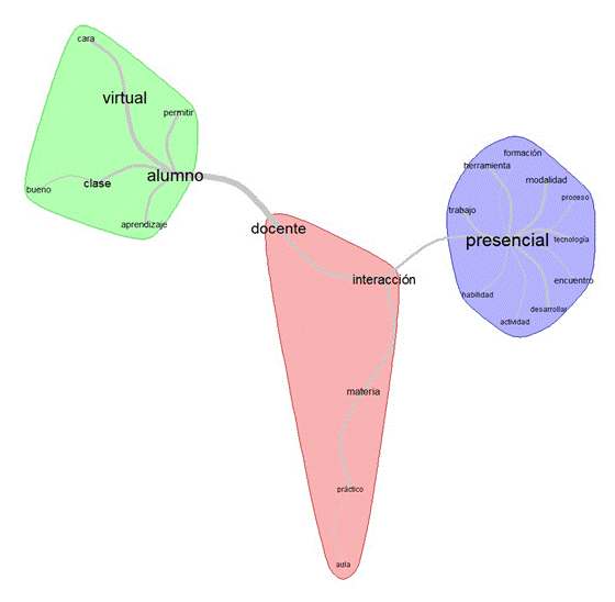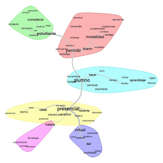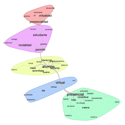 Por su parte, el análisis de similitud, puede observarse en la Figura 3, en donde se evidencian 5 grandes nodos, los cuales están representados por las formas ‘alumno’, ‘virtual’, ‘presencial’, ‘permitir’, ‘presencialidad’. El nodo ‘alumno’ conecta con términos asociados a ‘docente’, ‘interacción’, ‘clase’, ‘práctico’. Asimismo, está fuertemente vinculado al nodo ‘virtual’, asociado a los términos ‘dar’, ‘posibilidad’, ‘asignatura’. Este último nodo está vinculado al nodo ‘presencial’, asociado a ‘considerar’, ‘herramienta’, ‘tecnología’, ‘encuentro’. A su vez, el nodo ‘alumno’, se vincula con el nodo ‘permitir’, asociado a ‘modalidad’, ‘grande” y a ‘estudiante’, el cual se vincula al quinto nodo referido a ‘presencialidad’, ligado fuertemente a ‘virtualidad’.