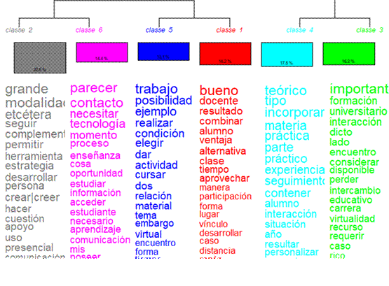Este análisis de clúster resulta confirmatorio del análisis de coorcurrencias realizado anteriormente. Nos encontramos con un primer universo representacional (clases 3 y 4) en donde se opta por la ‘presencilidad’ o lo ‘presencial’ -en el primer sentido del término-, entendiéndola como aquella opción en la cual en tanto se comparte un mismo tiempo y espacio físico entre docentes y estudiantes, se permite el encuentro, el intercambio y se asegurarían procesos de interacción; al mismo tiempo permitiría un mejor desarrollo de aquellas actividades prácticas, experienciales, en donde se puede hacer seguimiento y personalización del proceso.
