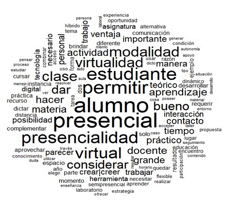 A partir de los análisis diferenciales según tipo de modalidad de preferencia, entre quienes optaron por la modalidad semipresencial (64%), opción mayoritariamente elegida entre docentes participantes, se observa que emergen con mayor frecuencia términos tales como ‘alumno’, ‘presencial’, ‘presencialidad’, ‘permitir’, ‘virtual’, ‘virtualidad’, tal como se representa en la Figura 5.