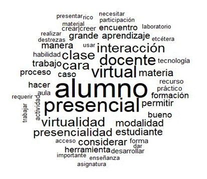La modalidad ‘presencial’ refiere, por un lado, a la posibilidad de compartir un mismo espacio y tiempo entre el alumno y el docente, lo cual se justifica en razones asociadas a la interacción cara a cara, la posibilidad de compartir elementos gestuales y emocionales, promover la mayor participación del estudiante, adquirir destrezas instrumentales necesarias, por ejemplo, en las prácticas de laboratorio. En la misma línea, la modalidad presencial permite atender a la falta de competencias de autogestión indispensables para llevar a cabo un cursado virtual por parte del estudiante, a la masividad, como así también, a la falta de recursos tecnológicos en las instituciones universitarias. Por otro lado, se refleja la idea de ‘presencialidad’ con apoyo tecnológico, haciendo referencia a la posibilidad de utilizar esos recursos para diseñar actividades, realizar trabajos prácticos, impartir audiovisuales, entre otros; sin reemplazar en su totalidad la interacción cara a cara. Al efectuar los análisis diferenciados, entre aquellos educadores que prefieren la modalidad presencial, el término que aparece con una frecuencia significativa y que permitiría adjetivar la asociación entre las formas “alumno”, “docente” y “presencial”, refiere a los procesos de “interacción”. En este subgrupo de docentes, se justifica dicha elección en tanto se entiende que es la opción pedagógica que permitiría asegurar los procesos de interacción.