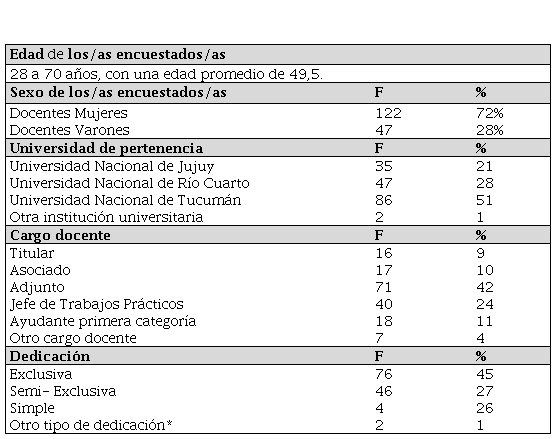 La muestra estuvo conformada por 169 docentes entre 28 y 70 años, con una edad promedio de 49,5. El 72% (n=122) son mujeres y el 28% (n=47), varones. El 21% (n=35) pertenece a la Universidad Nacional de Jujuy, el 28% (n=47), a la Universidad Nacional de Río Cuarto, el 51% (n=86) forma parte de la Universidad Nacional de Tucumán, el 1% (n=2) informa trabajar en otra institución. El 9% (n=16) posee cargo de docente titular, el 10% (n=17) de docente asociado, el 42% (n=71) de adjunto, 24% (n=40) de jefe de trabajos prácticos, el 11% (n=18) ayudante graduado de primera categoría y el 4% (n=7) posee otros cargos docentes. El 45% (n=76) posee dedicación exclusiva a la docencia, el 27% (n=46) dedicación semiexclusiva, el 26% (n=4) dedicación simple y el 1% (n=2) corresponde a docentes que son contratados por hora cátedra.