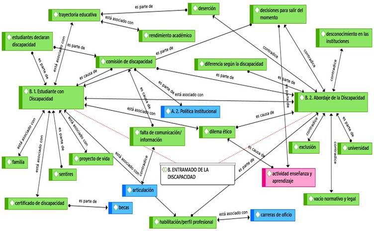 En lo referente a la categoría que abordaremos en esta ocasión, Entramado de la discapacidad, en general podríamos estar señalando que los entrevistados (autoridades y personas que ejercen cargos de gestión en la UNRC) hacen alusión a que el estudiante con discapacidad encuentra en la universidad un lugar que le permite realizarse mediante un proyecto de vida, que al mismo tiempo genera diversos sentires (temores, ansiedades), que inciden en el camino de las trayectorias educativas singularizadas. En este sentido, también se argumenta que la familia, en ocasiones condiciona los procesos educativos, estando presente en la vida académica de los estudiantes con discapacidad, por ejemplo, tomando decisiones por ellos.
