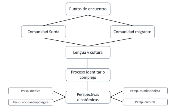 Es innegable que la comunidad sorda y extranjera poseen puntos de encuentro: con relación al idioma y cultura, que difieren de la mayoría del territorio nacional; el experimentar procesos identitarios complejos; y, por último, la forma en que la sociedad los visualiza desde dos perspectivas dicotómicas.