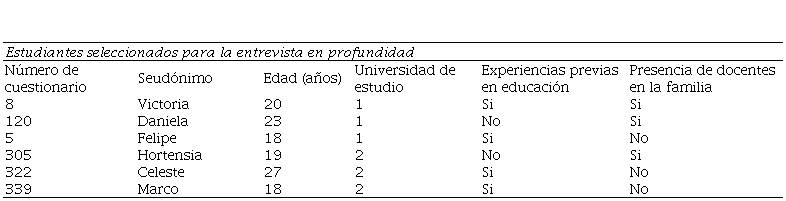 Para la segunda parte, dedicada a la fase cualitativa, se seleccionó una muestra anidada que consistió en un subconjunto del grupo mayor que participó en la primera fase (Hernández-Sampieri y Mendoza, 2018). La selección de los participantes tomó como punto de partida sus respuestas al cuestionario y siguió un muestreo con variación máxima (Glaser y Strauss, 1967), en el que se seleccionaron seis estudiantes con características diferentes en cuanto a universidad de estudio, sexo, edad, experiencias previas en educación no formal (asociaciones, grupos juveniles o similares) y presencia de docentes en la familia. En la Tabla 1, se detalla lo mencionado.