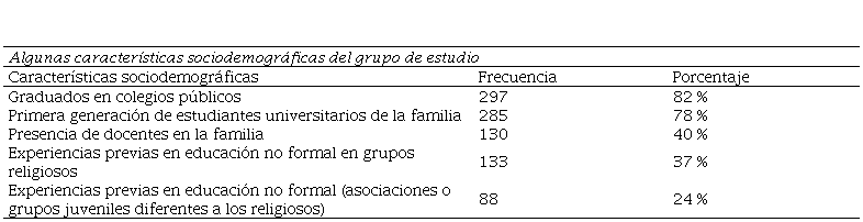 Los resultados se presentan en dos partes. La primera se refiere a las características sociodemográficas del grupo de estudio y la segunda recoge los resultados de las entrevistas en profundidad. Para los fines de este artículo, la primera parte relativa a las características sociodemográficas se presenta de manera escueta, con énfasis en los hallazgos que se utilizaron para el desarrollo de la entrevista, como, por ejemplo, la presencia de docentes en la familia y las experiencias previas en educación.