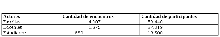 Por último, si bien, como se mencionó anteriormente, estos encuentros se desarrollaron tanto con la comunidad docente, con estudiantes y con las familias, la sistematicidad y cantidad de encuentros convocados por parte de las autoridades ha sido diferente, en proporción, según los actores convocados. En este sentido, según menciona el informe de gestión, se han desarrollado 1.875 encuentros con docentes, a los cuales concurrieron 27.019 docentes, y se realizaron 650 encuentros con estudiantes en los que participaron 19.500 de ellos. En el caso de los encuentros con madres, padres y tutores, se realizaron 4.007 encuentros, 1.577 en el 2018 y 2.450 en 2019, en los cuales participaron 89.440 familiares.[15]