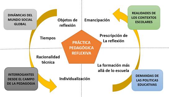 La práctica pedagógica como práctica profesional implica “la capacidad del maestro para pensarse en sus múltiples relaciones con el saber, la ciencia y la cultura, al tiempo que el espacio para producirse de maneras diversas, desde la enseñanza” (Rodríguez, 2006, p. 24), ante lo cual, afirman Montoya y Arroyave (2023), “la reflexión frente a la práctica no solo oscila entre la tensión entre lo conceptual y lo procedimental, sino también, en el escenario de su aplicación, es decir, entre el contexto escolar y la cultura” (p. 5). Esto configura una cuestión trazada por las políticas educativas que reclaman la necesidad de adaptar la educación a las nuevas demandas desde reformas curriculares, que pretenden “dotar a los estudiantes de recursos personales, intelectuales y morales para adaptarse a las nuevas circunstancias (…) lo cual supone garantizar sólidos fundamentos y elevados estándares para todos” (López, 2020, p. 149).