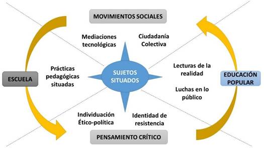 Es en este marco donde aparecen propuestas de diversa índole, desde las cuales se defiende, justamente, el hecho de que la escuela abra sus puertas a las dinámicas de las comunidades que entretejen su contexto. Y, desde allí, reconocer, en el movimiento social y en las luchas situadas, un caldo de cultivo que permita materializar principios de formación y constitución de subjetividades que impliquen una colocación de sujetos, entendida como la necesidad de ubicación desde su consciencia histórica (Betancur, 2021). Lo cual deriva en “la tarea principal de reconstruir una multitud de racionalidades locales ubicadas sobre territorios específicos, adecuando esas necesidades locales a los procesos, de tal manera que se conviertan en potencialidades transformativas” (Mejía, 2019, p. 66).