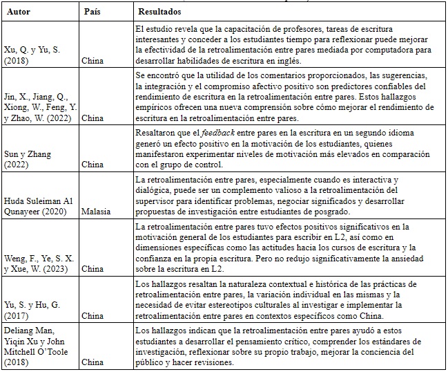 La retroalimentación entre pares, también conocida como evaluación entre compañeros, es una forma de aprendizaje en la que las evaluaciones constructivas se realizan entre los estudiantes, sobre sus esfuerzos y sus deberes académicos. Por lo tanto, los compañeros se desempeñan como evaluadores, con comentarios, sugerencias y críticas. El principio es que se lleve a cabo de manera profesional, constructiva y sin sesgos (Salih, 2013). A continuación, se presentan los resultados más significativos en este tipo de retroalimentación (Tabla 1).