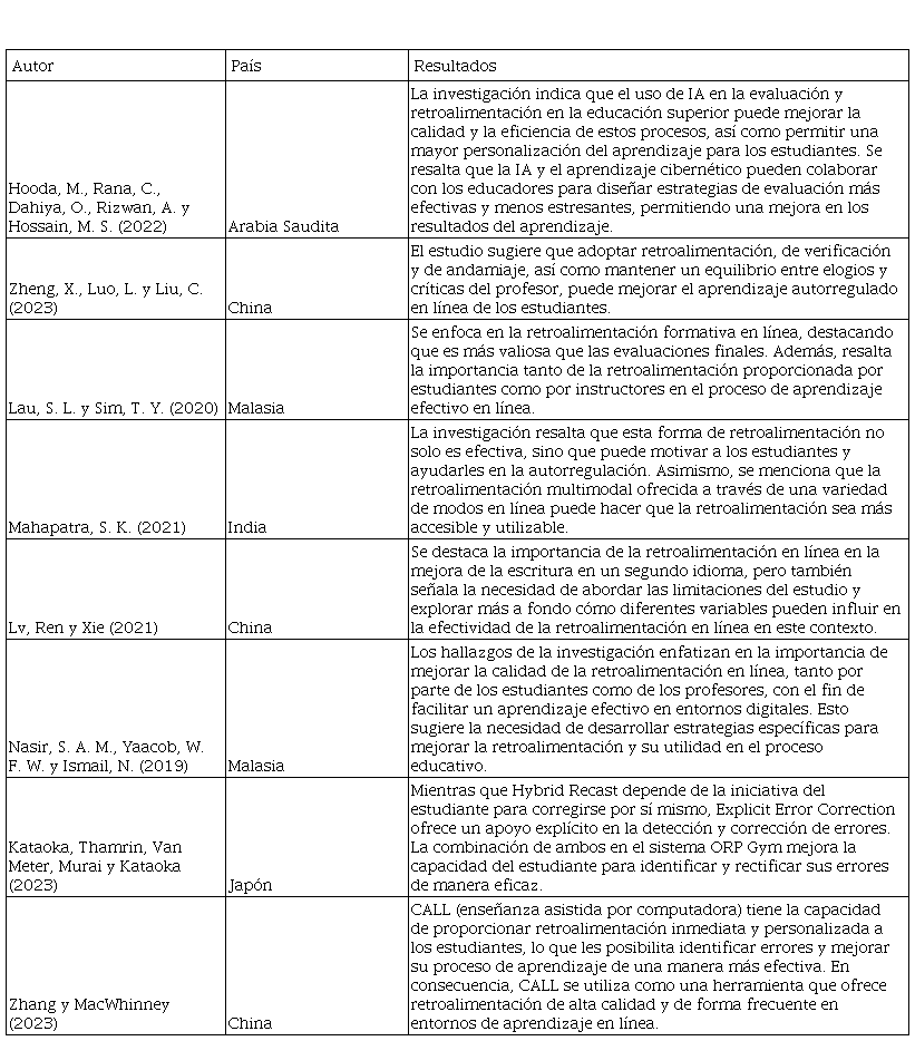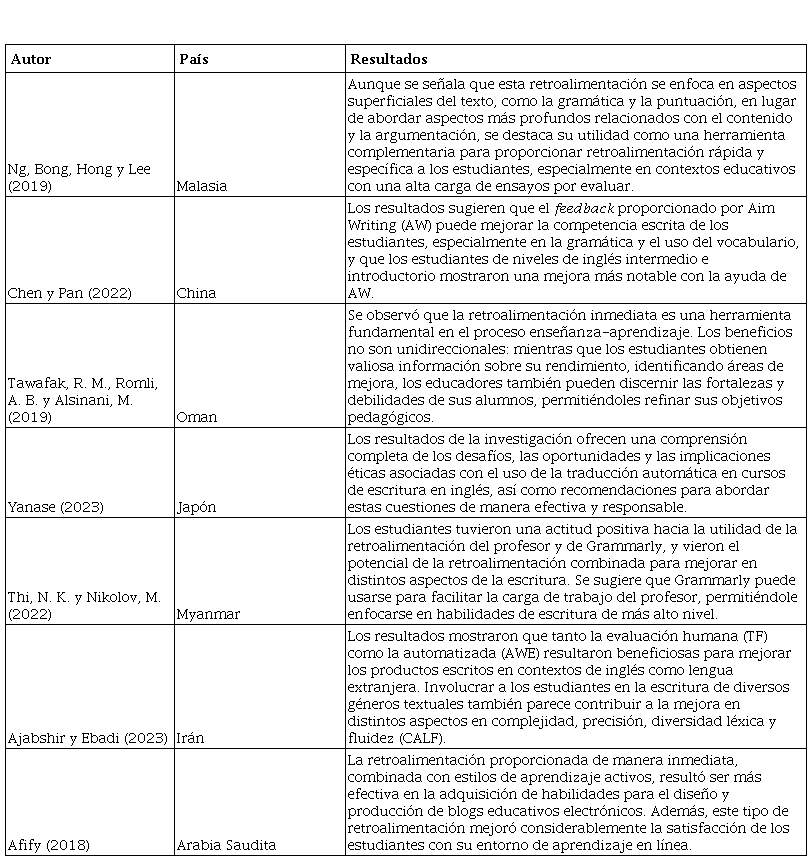 La implementación de las inteligencias artificiales en el contexto educativo superior en el siglo XXI se encuentra en pleno auge, puesto que tiene la oportunidad de mejorar y enriquecer la retroalimentación, a través de análisis cibernéticos del trabajo de los estudiantes, al brindar retroalimentación escrita personalizada e inmediata de acuerdo con estilos de escritura y normas gramaticales. A continuación, se presentan los resultados más significativos en este tipo de retroalimentación (Tabla 2).