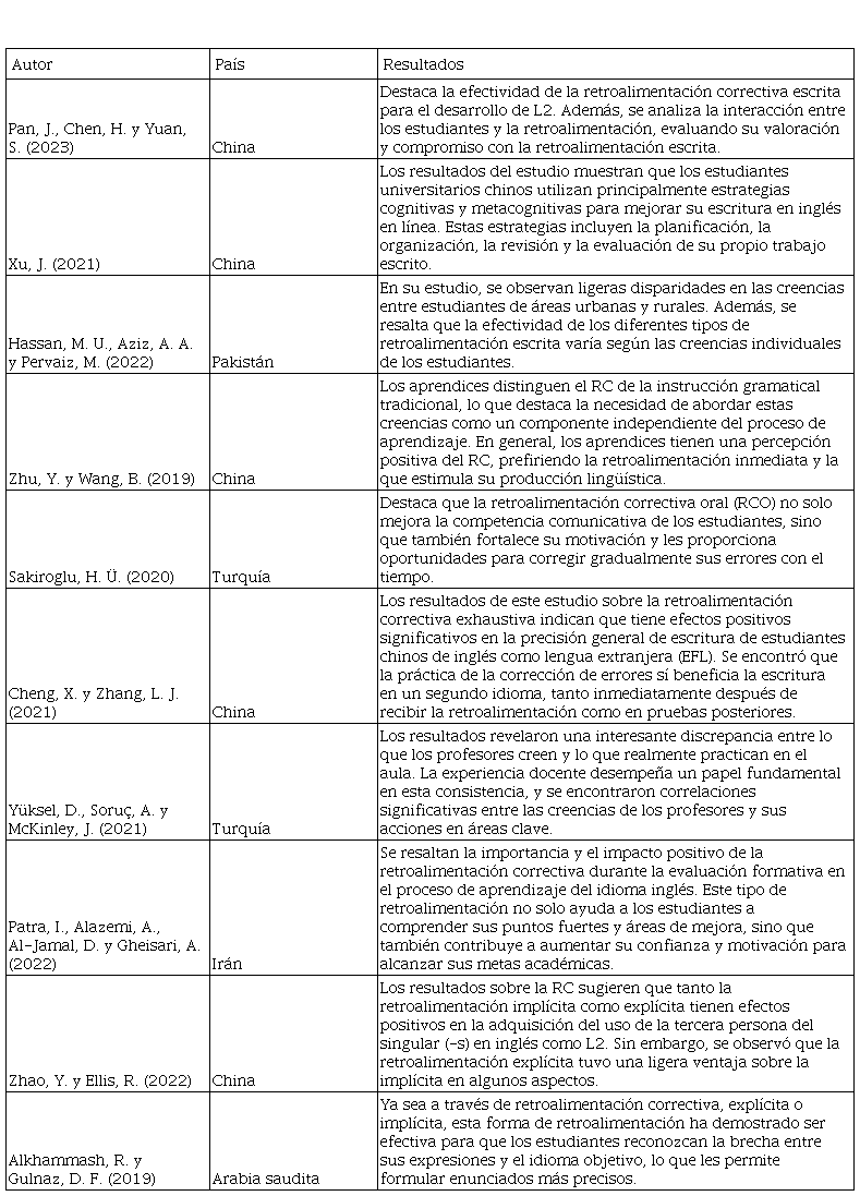 La retroalimentación correctiva (RC) se define como la información proporcionada a los estudiantes sobre los errores lingüísticos presentes en su producción oral o escrita en una segunda lengua (L2). Tanto la retroalimentación correctiva oral como la escrita ha ganado importancia en los últimos tiempos debido a su relevancia para avanzar en las teorías sobre la adquisición de L2 y su papel destacado en la enseñanza de L2 (Sheen y Ellis, 2011). Este tipo de retroalimentación tiene el potencial de no solo identificar deficiencias, sino también de ofrecer las correcciones necesarias para promover una comprensión más profunda y precisa del material. Varios estudios han explorado la eficacia y las metodologías relacionadas con la retroalimentación correctiva. A continuación, se examinarán investigaciones clave que han abordado este tema, brindando una visión completa de su importancia y aplicabilidad en diversos contextos educativos (Tabla 4).