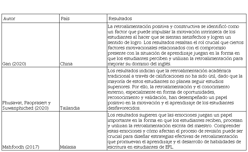 Los estudios indican que la retroalimentación es una práctica efectiva necesaria para la autorregulación del aprendizaje, aumentar la motivación de los estudiantes, mejorar el rendimiento académico y fomentar la participación de los estudiantes en el curso (Hooda et al., 2022). Es importante considerar cómo los estudiantes reciben la retroalimentación y tener en cuenta sus emociones, lo cual está estrechamente relacionado con la motivación. Mahfoodh (2017) la define como “una de las influencias más poderosas en el aprendizaje porque apoya el desarrollo cognitivo de los estudiantes, resalta sus debilidades y fortalezas” (p. 23) y destaca la importancia de la respuesta emocional del estudiante ante la retroalimentación. Se reconoce que el feedback es una herramienta crucial para el aprendizaje, pero su efectividad depende de la competencia en la lectura y la escritura de retroalimentación de los estudiantes, que implica tanto su capacidad cognitiva como socioafectiva para participar de manera efectiva en el proceso de retroalimentación (Li y Han, 2022). En este contexto, la retroalimenación de los profesores pueden tener un impacto tanto positivo como negativo, con una voz de autoridad académica, al compartir conocimientos, con la expectativa de que los estudiantes realicen revisiones pertinentes para mejorar su aprendizaje (Jin y Ruan, 2023).